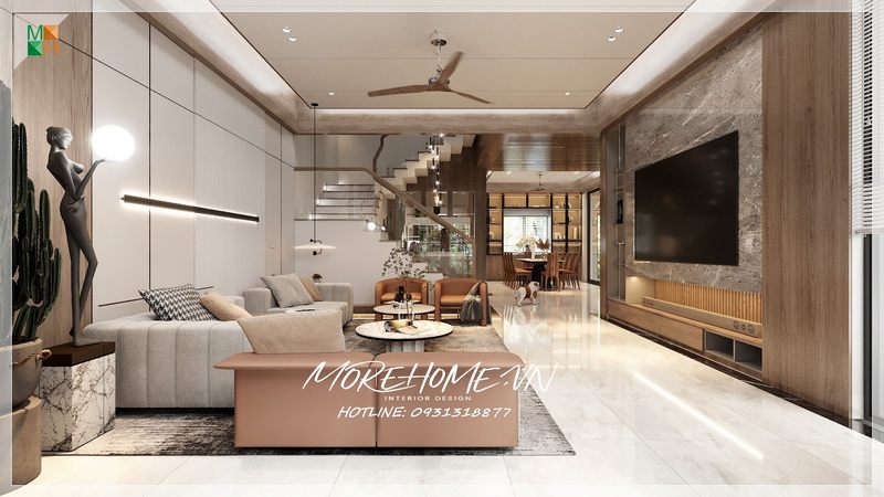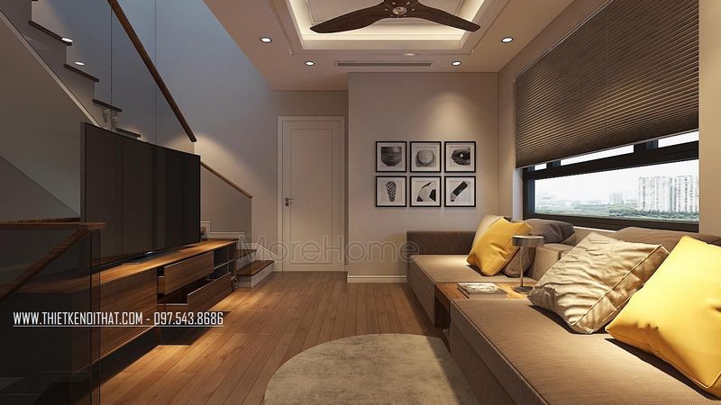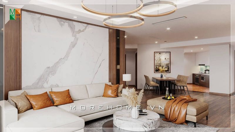 Bộ bàn ghế sofa được thiết kế theo phong cách hiện đại bao gồm: ghế sofa văng, ghế sofa đơn và bàn trà đôi hình tròn. Bộ bàn ghế sofa linh hồn của phòng khách.