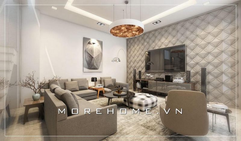 Bộ sofa bọc nỉ cao cấp được lựa chọn cùng tông màu xám của mảng tường tạo sự mới lạ, hiện đại cho không gian phòng khách.