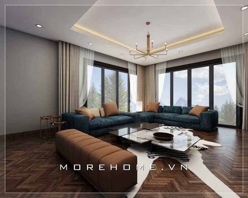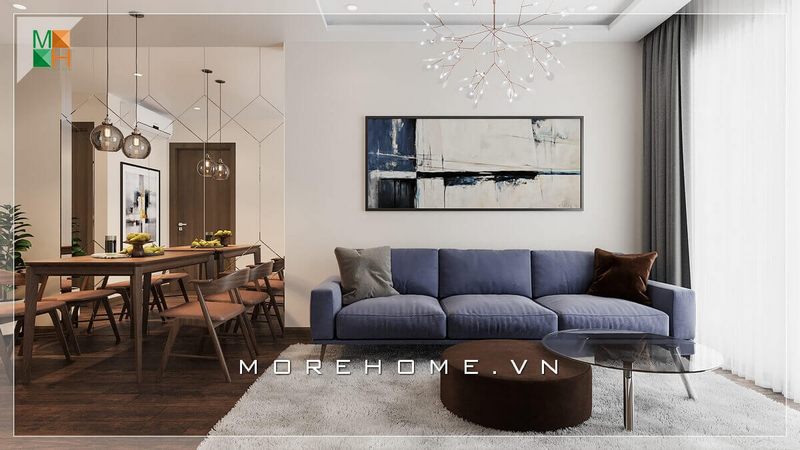 Mẫu thiết kế phòng khách hiện đại có diện tích nhỏ như chung cư, nhà phố, với bộ sofa văng bọc nỉ màu xanh tạo điểm nhấn nổi bật cho không gian căn phòng