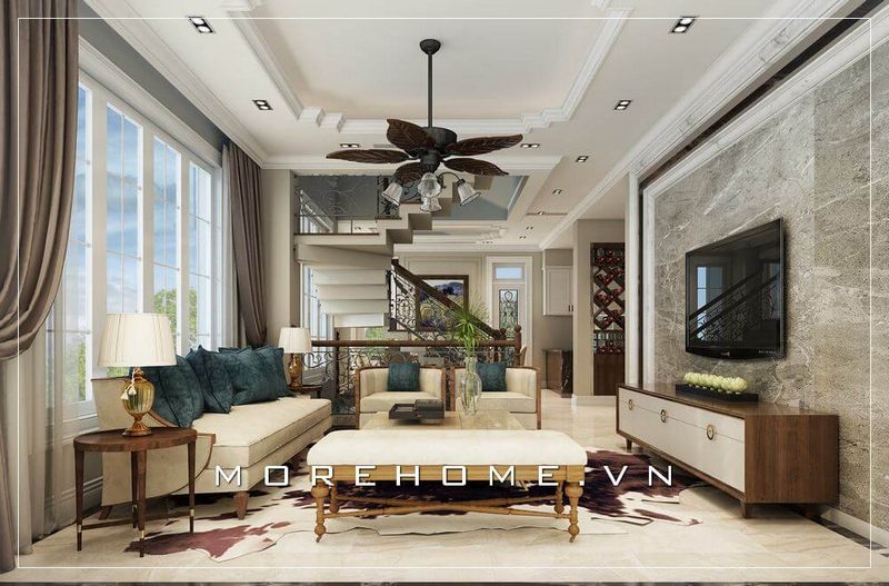 Kiểu dáng Sofa đương đại sang trọng với phần khung gỗ tự nhiên màu nâu cao cấp tinh tế cùng vỏ bọc nỉ nhung màu kem cho phòng khách biệt thự thêm ấn tượng.