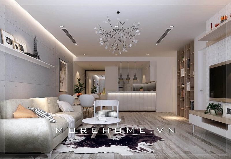 Thiết kế sofa dạng góc tiện lợi tối ưu không gian phòng khách căn hộ chung cư sang trọng với sắc trắng tinh tế từ vỏ bọc da cao cấp.