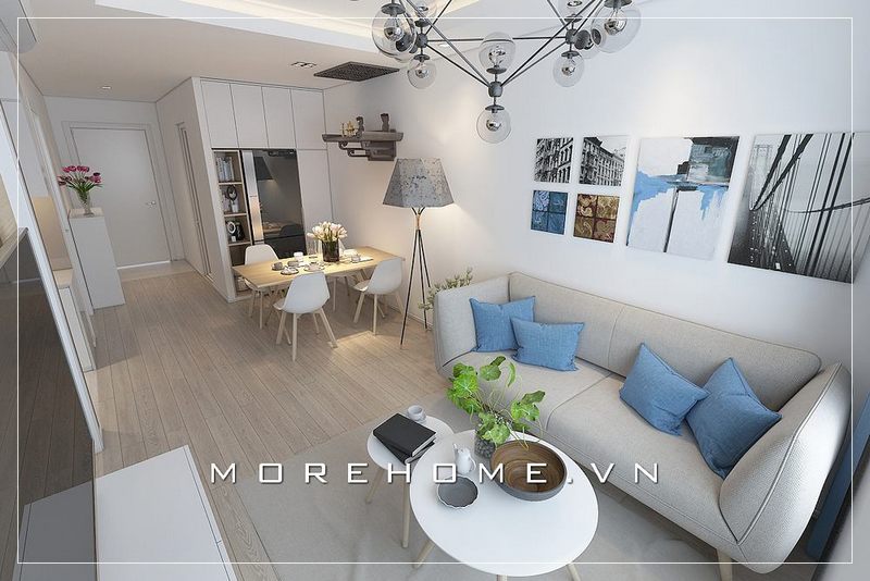 Phòng khách căn hộ chung cư được tối đa với thiết kế sofa dạng văng nhỏ gọn với sắc màu kem nhẹ nhàng tinh tế.