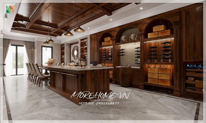 Gợi ý thiết kế tủ rượu trong phòng ăn bằng gỗ óc chó phong cách tân cổ điển cho biệt thự