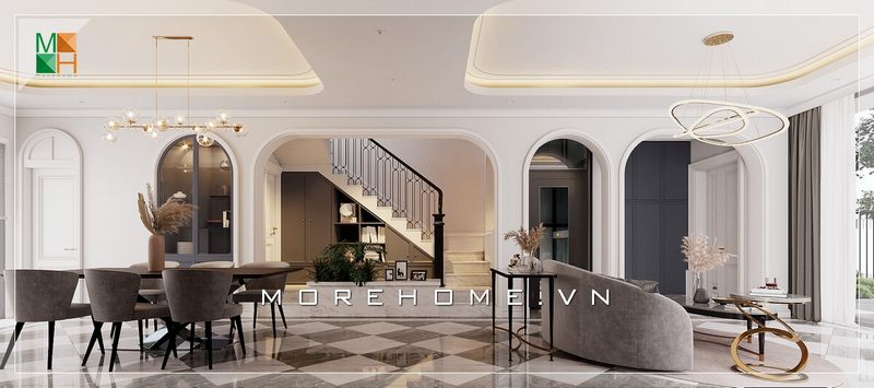 Đẹp mãn nhãn với mẫu thiết kế phòng khách liền phòng ăn với nột thất tông màu ghi xám cao cấp, sang trọng dành cho biệt thự phong cách tân cổ điển