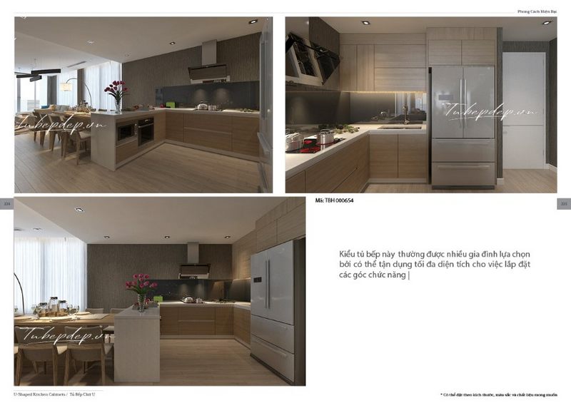 Mẫu tủ bếp gỗ tự nhiên màu nâu, thiết kế kiểu dáng chữ L cho phòng bếp sang trọng và tiện nghi