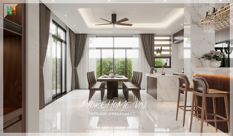 Chiêm ngưỡng thiết kế phòng bếp - ăn cao cấp của biệt thự, nhà phố hiện đại có đầy đủ bàn đảo, quầy ba, bàn ăn lớn,... là vị trí tuyệt vời để các gia chủ lựa chọn cho bữa cơm gia đình thêm gần gũi.